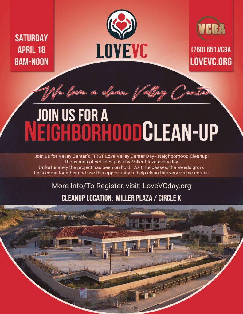 LoveValleyCenter announces the first Love Valley Center Day. Join us for Valley Center’s first Love Valley Center Day – Neighborhood Cleanup!